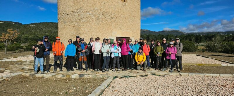 Continúan hasta llegar a una zona desde la que observan en la lejanía una torre que se alza esbelta, se trata de la Torre de la Mixarda. Es visitable y Pau gestionó con el Ayuntamiento de Figuerola del Camp su visita alrededor de la 11:00 horas, en contacto con la guia. El día anterior a la visita Pau recibió llamada de la guía informándole que ante la previsión de lluvia y viento la torre no tenía capacidad para poder permanecer todos en su interior por lo que, lamentablemente, se anuló la visita.